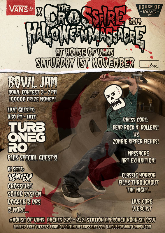 Well, this looks pretty damn amazing. Not only has this year’s Vans x Crossfire Halloween Massacre got a superb fancy dress theme (Dead Rock n’ Rollers vs Zombie Ripper Fiends), there’s also €10,000 in prize money up for grabs in the unisex bowl competition AND it’s in House of Vans, which is located in the genuinely creepy and totally thematic Old Vic tunnels. It’s also on November 1st, so you don’t have to feel guilty about missing your mate’s shitty house party for it. Good news all round!