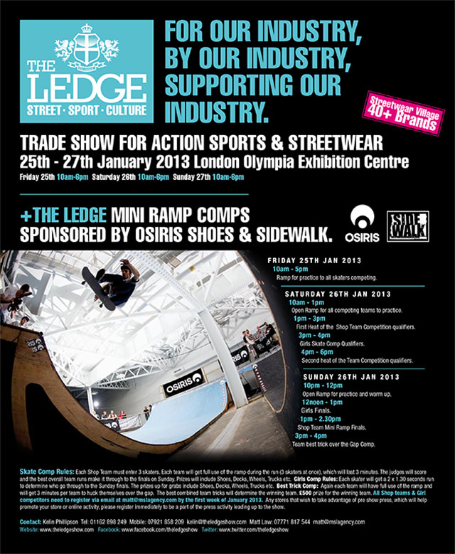 We know this is a bit mean since the action sports and lifestyle trade show The Ledge in London Olympia isn’t open to public, but since Osiris are giving a year’s sponsorship (in shoes) for their mini ramp contest, we figured it would be mean not to tell you either, as we’re sure our readers are clever enough to sneak in any ways (at least some…).