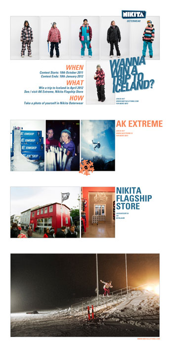 The trip entails a visit to the flagship store in Reykjavik to choose some new Nikita gear, a look-see at Nikita HQ to meet everyone including founder and head designer Heida Birgisdottir, party with the crew (no mean feat in itself), go snowboarding with them, enjoy a soak at the hazy Blue Lagoon and attend the AK Extreme festival of snowboard and music mayhem where the likes of homegrown talents and global gob smackers Halldor Helgason and Gulli Gudmundsson will most likely be riding once again.  The event is held in the north of Iceland in a town called Akureyri.