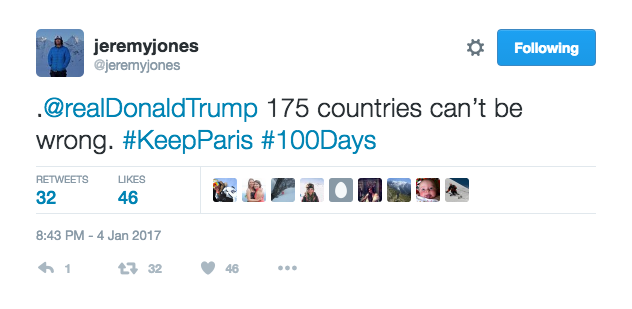 The #KEEPPARIS hashtag emerged overnight, and the project intends to get it trending on Twitter today (5th January) , and through the night, in a bid to, at least, get Trump to take notice of, if not climate change – which he famously denies exists – then recognise the voice and will of a large group of American people.