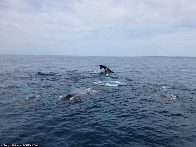 Robyn was  on a whale-watching trip on the New South Wales coast in Australia when she noticed the little pup zooming through the whitewater, on top of one of the blue giants.