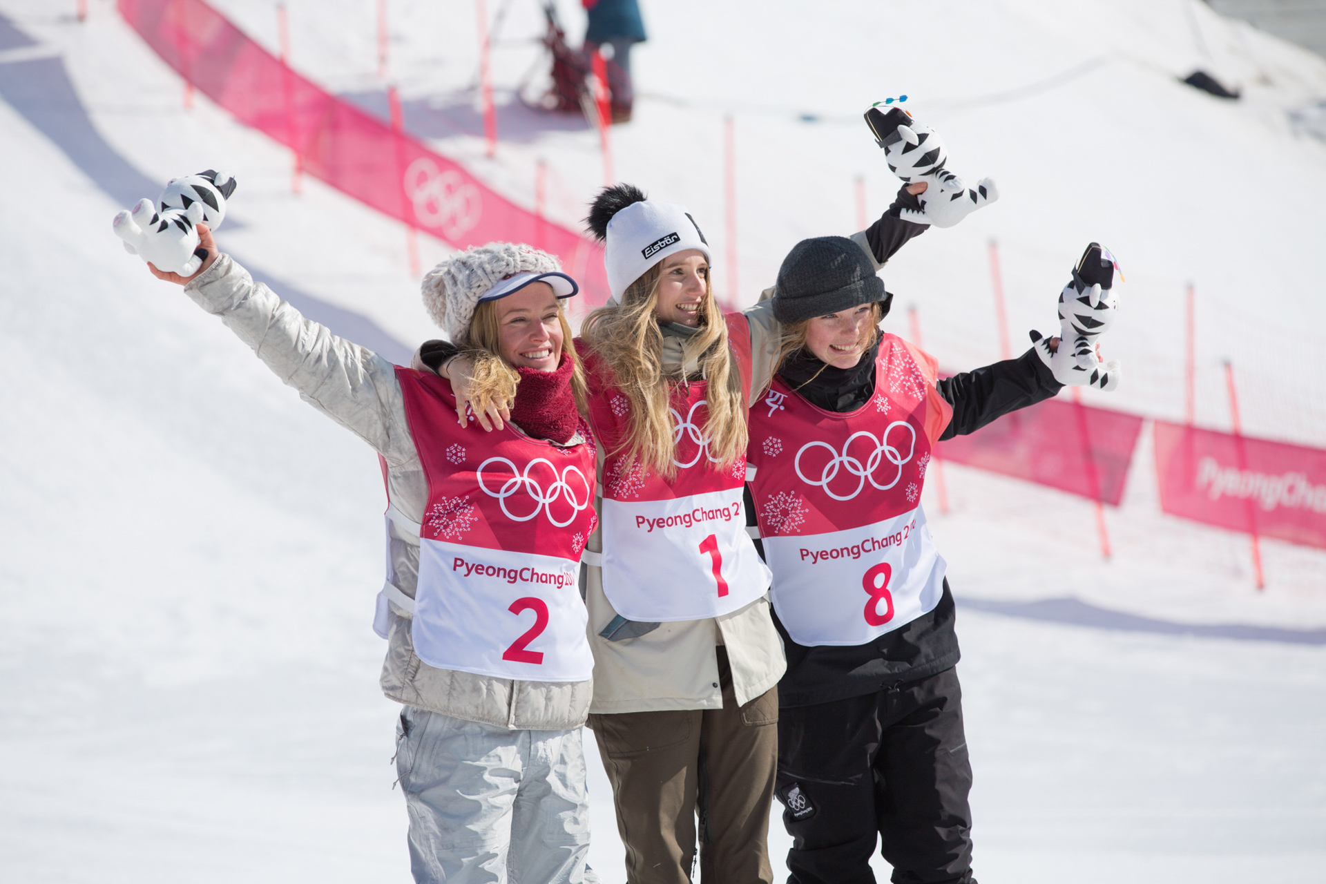 Zoi Sadowski Synnott took bronze, Jamie Anderson took Silver, and Anne Gasser won gold in the women’s Big Air final at the 2018 Olympics – Photo: Sam Mellish