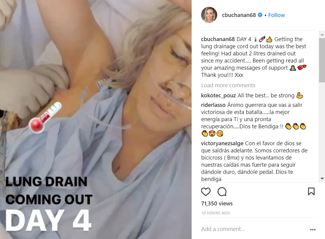 Multiple-time mountain bike World Champion and Australian Olympic BMX racer Caroline Buchanan is beginning 2018 in intensive care after a car crash left her with a broken sternum, broken nose and collapsed lungs.