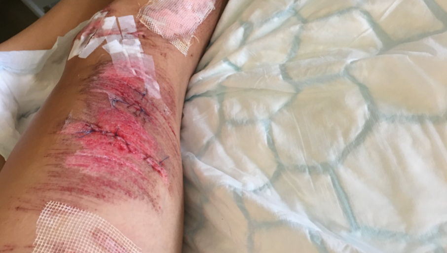The end result was two serious cuts around 7cm long, one close to Lauren’s knee and the other on her lower leg.