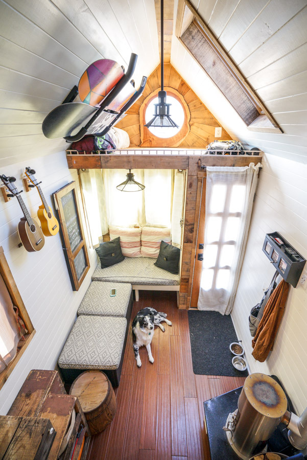 Snowboard legend Mike Basich decided to give up his 4,000 square foot house and live in this tiny (but seriously cool) log cabin in the Sierra Nevada mountains.