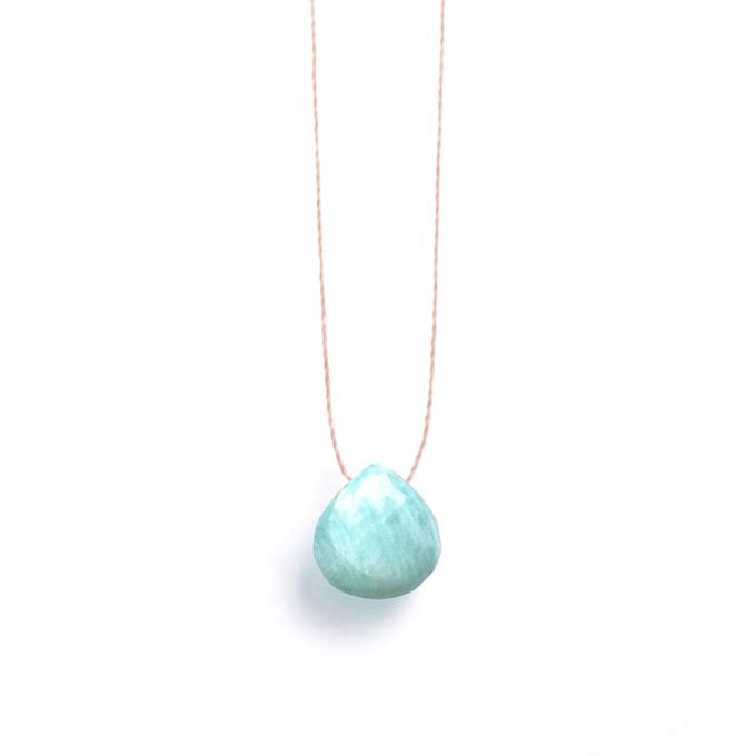 The necklace pictured is made from blue-green amazonite, a semi-precious stone. It is said to promote optimum health and discourage negativity.
