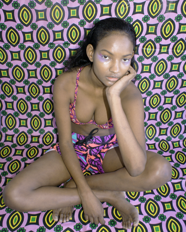 Pink swimsuit ADIDAS ORIGINALS x JEREMY SCOTT, poodle hi-tops ADIDAS ORIGINALS x JEREMY SCOTT; swimsuit VOLCOM, wings hi-tops ADIDAS ORIGINALS x JEREMY SCOTT