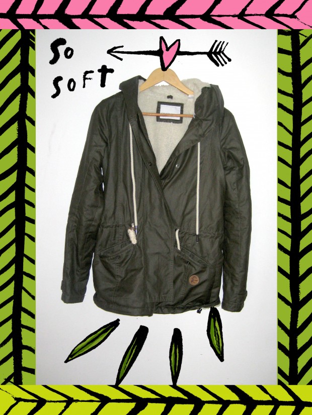 “It was raining today so I busted out the waxy green rain jacket with hood. The hood folds out to fisherman-jacket proportions which kept my face dry. It is also lined with fleece so super warm.”