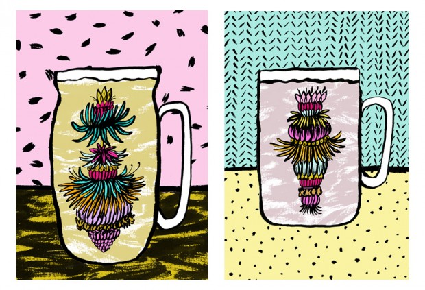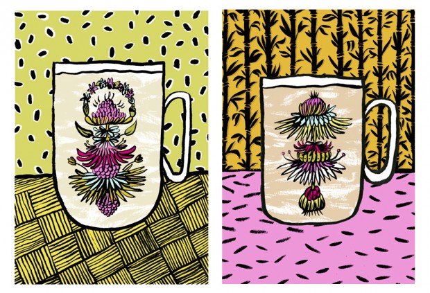 Inspired by bright summer colours, I finished a series of flowering tea illustrations. Flowering tea is amazing – it blooms in hot water before your eyes and tastes delicious and refreshing too. The best way to enjoy them is in a clear glass mug – that way you can enjoy the intricate petal formations. Once I had finished these illustrations, I had big copies printed to hang in my house.