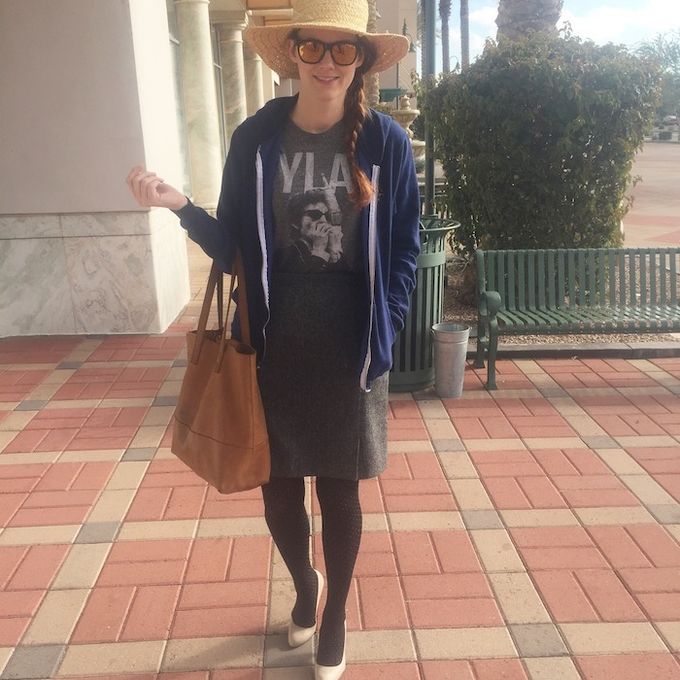 “The first few items were great: my Bob Dylan tee, with a grey skirt, and tights. I think I’ll put this in my rotation… But then before I could finish, he pointed to my nude heels.”