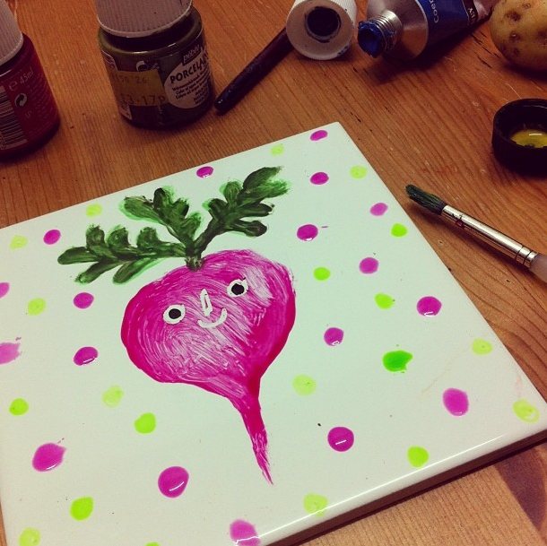 This week I also hand painted this little beetroot fella onto a tile, in preparation for a workshop I ran.