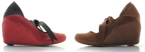 The Betty range comes in a rainbow of colours, including brown, cuoio(light brown), black, crimson/black and purple/black so there’s something to suit every taste – and match every outfit. The red skyscraper wedges with a black ribbon tie incorporate the new winter trend of ribbon tie shoes that have been gracing the feet of many a celebrity of late.