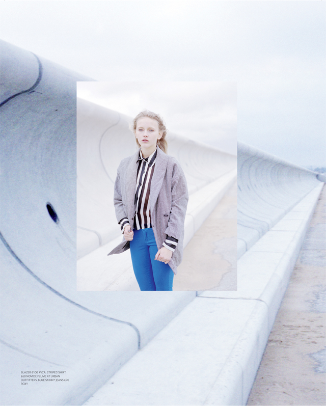 grey RVCA jacket, stripe URBAN OUTFITTERS shirt, blue ROXY jeans, pink TOPSHOP jumper, grey INSIGHT jeans