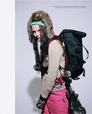 right: ROXY cardi, pants and beanie, JANSPORT backpack, NOBIS furry hat, BILLABONG gloves