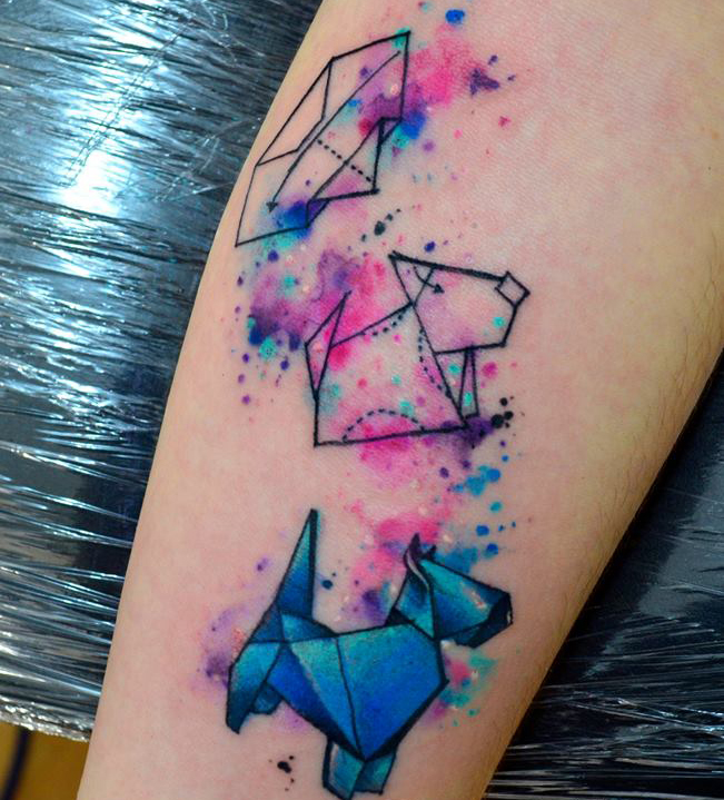 We like the simple line drawing with colour splashed around them. It almost makes them look painted on, compared to regular tattoos.