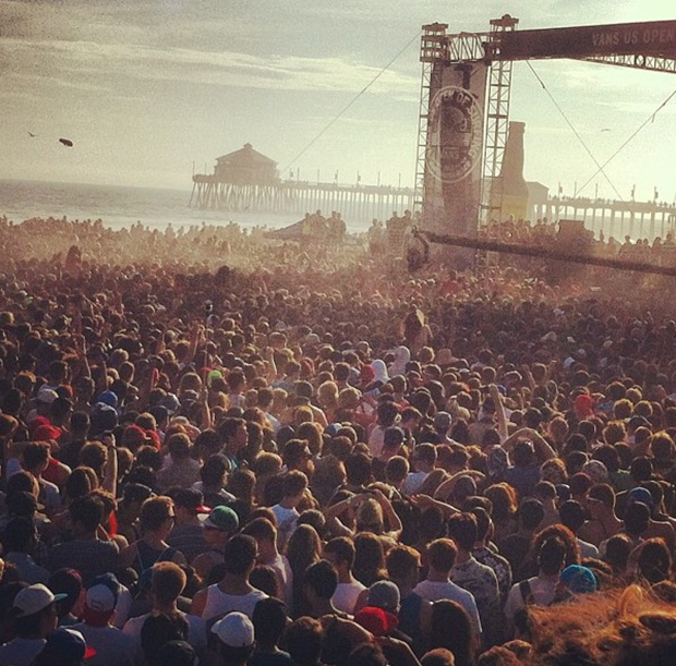 We were so into artist/skater Ed Templeton of Toy Machine fame’s #dailyhbpierphoto updates that we kept stalking him on his instagram tempster_returns all weekend. We did also watch the surfing, too good to miss! Here are some more pictures he took of pre riot Modest Mouse crowds, randomly cool tattoos, skateboarding girls, little pervs with go pros and fans writing his name in the sand at the Vans US Open of Surfing.