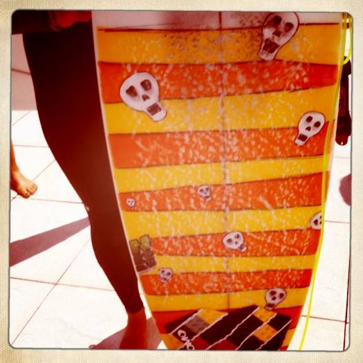 First it was wetsuits and now it’s boards too. UK surfer Holly Donnelly favours tangerine-stripes and skulls (picture below), while Malia Manuel (video below) likes to work it floral or should that be Triffid-style? What is clear is that an off-white mottled sand-crusted mess is out and surfboard art is in. But you do have to (at least pretend) to do it yourself and it does have to be good. Where did I put Banksy’s email again?