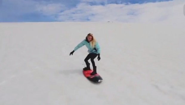 Laura Enever goes snowboarding on a surfboard in Iceland!!