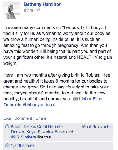 It’s a topic that’s been talked about for decades, but professional surfer and new mum Bethany Hamilton spoke out about her post-baby weight yesterday. Her response was really inspiring.