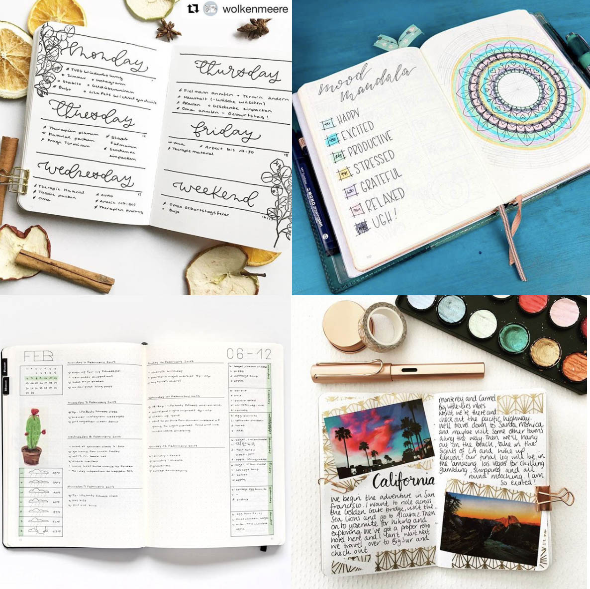 Everything you need to do that day – from appointments to ‘buy dog food’. You can make these super basic lists (à la Ryder Carroll) or create a beautifully intricate design with calligraphy and watercolour paints, depending on how much time you have.