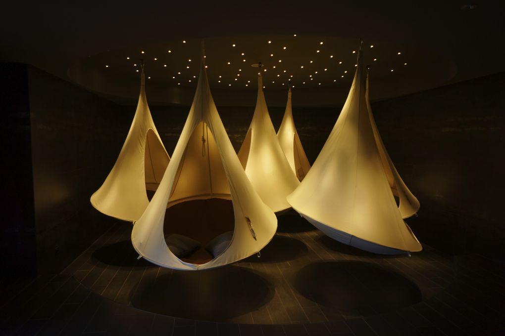 The indoor spa is stunning with an Epsom salt bath and sleep pods hanging from the ceiling; the infinity pool overlooks the lake; the juice terrace is filled with beanbags and comfy sofas.