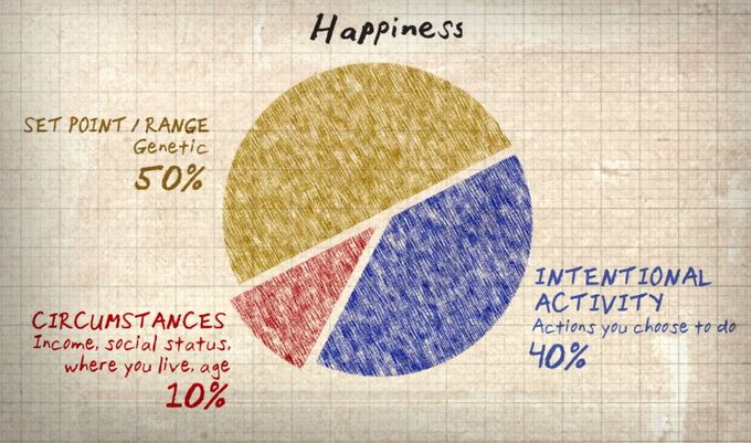 This pie chart shows what makes people happy in broad terms. It was part of a study made by psychologist Sonja Lyubomirsky.