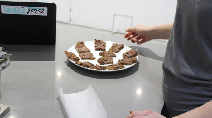 Turn out the mixture onto a baking sheet and press it into a flat layer of the desired thickness. Roll a rolling pin over the top to smooth it to a uniform thickness. Place the baking sheet in the freezer or refrigerator for 30 minutes to harden, then slice into bars of the desired size. Store in a sealed container in the pantry or refrigerator.