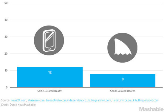So far this year, 12 people have been killed by selfies, compared to the eight attacked by sharks…